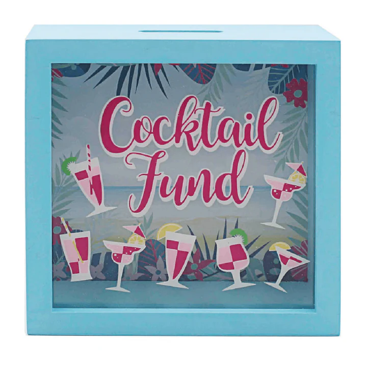 • Square shaped money box with colourful text reading cocktail fund. This piece is wood made with a blue finish. It has a coin slot on its top with an opening underneath. Works as a great gift for adults to start saving up their spare pocket money and change.